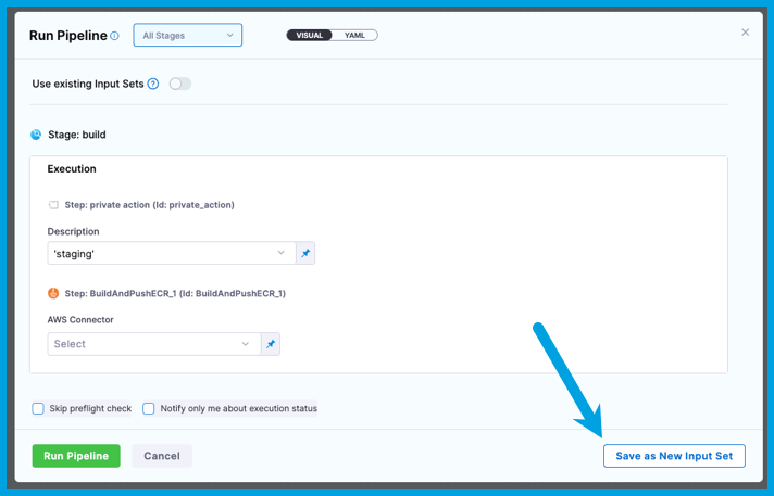 When you run a pipeline that requires runtime input, you can select Save as New Input Set to quickly create an input set from your provided values.